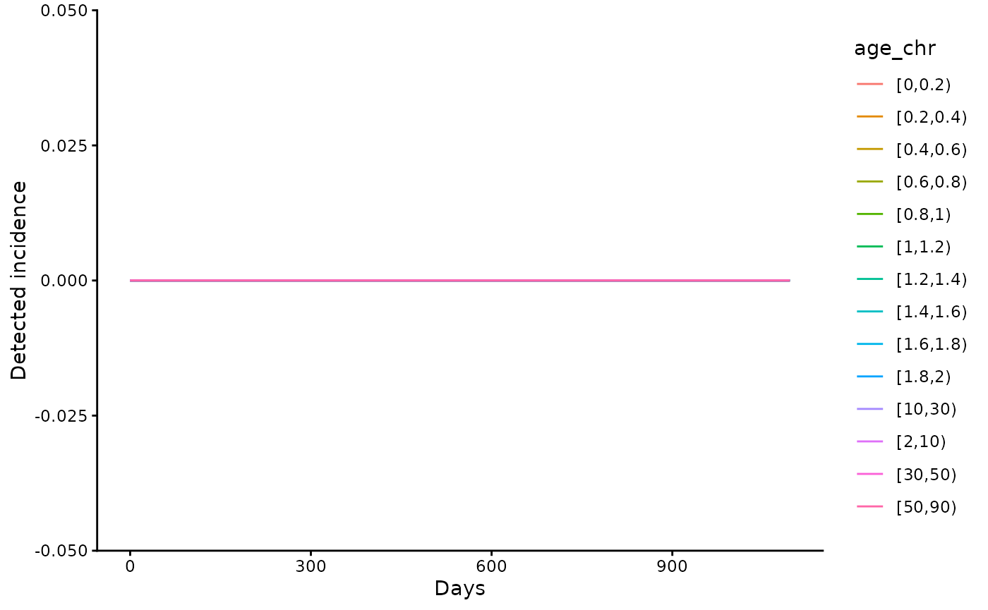 The incidence and detected incidence. To calculate the detected incidence age-specific detection probabilities are used, and in the default parameters we assume no one over the age of 2 years old is tested.