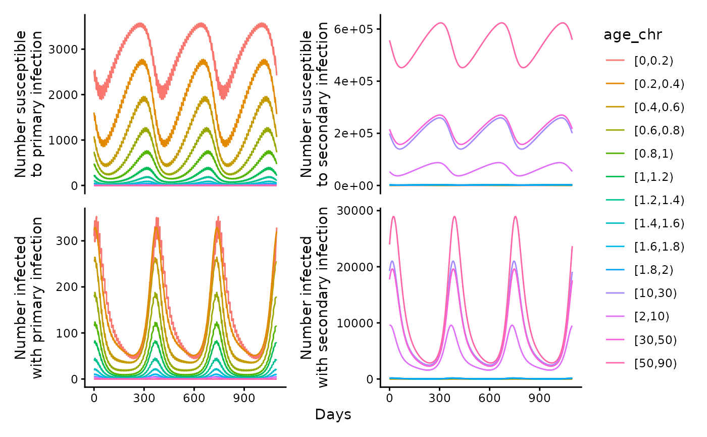 In brief, the model is age-structured and primary (the first) and secondary infections (any subsequent infection) are specifically tracked. The force of infection is determined by a seasonal forcing function and the age-specific contact matrix (the mean contacts per person).